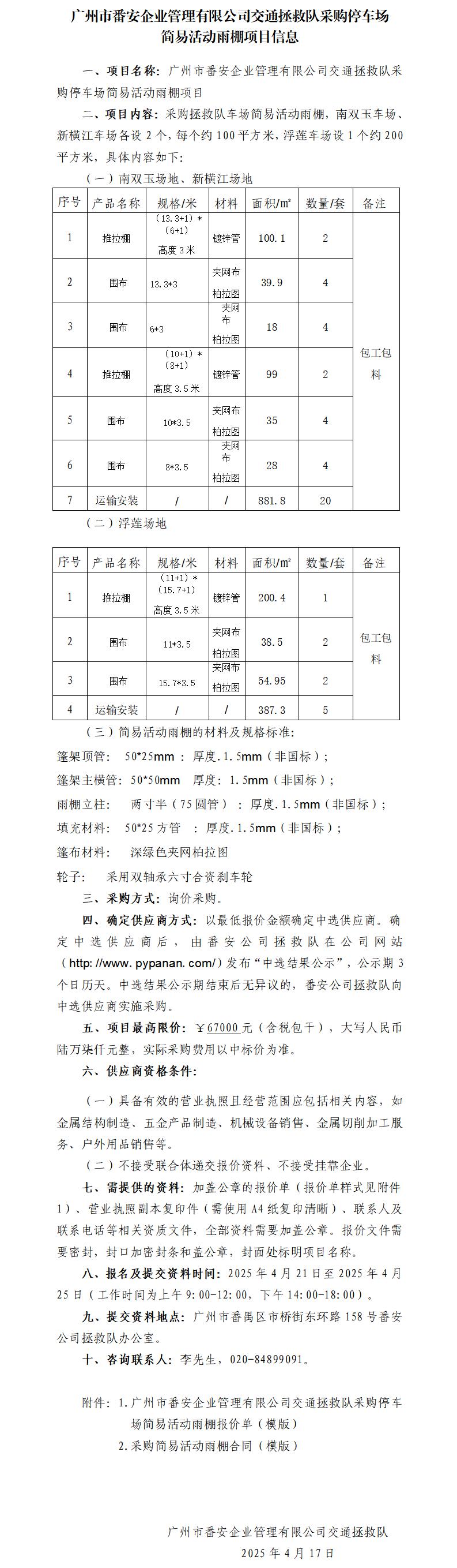 附件1 廣州市番安企業管理有限公司交通拯救隊采購停車場簡易活動雨棚報價單(模版).xls