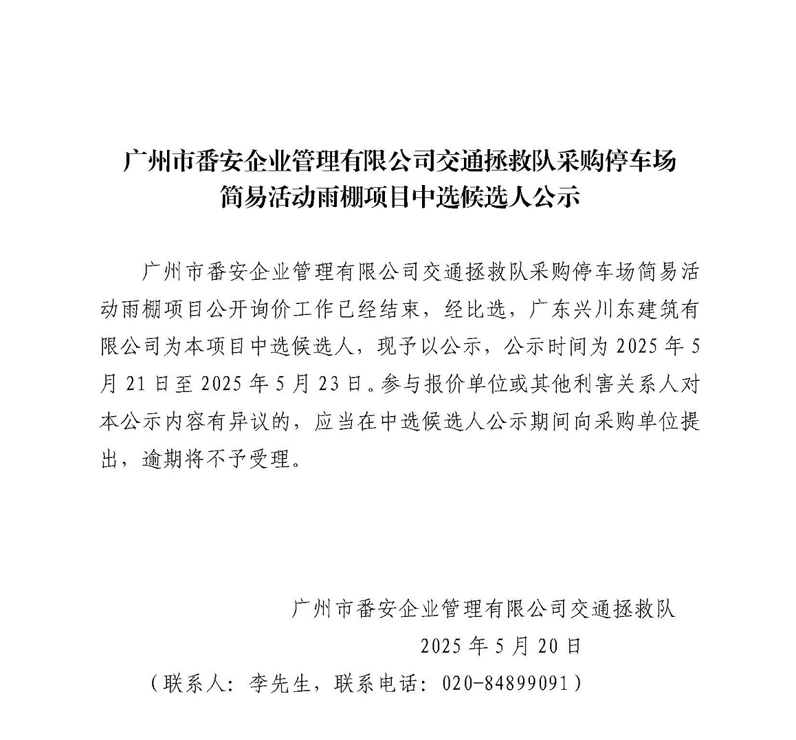 廣州市番安企業(yè)管理有限公司交通拯救隊(duì)采購(gòu)?fù)\噲?chǎng)簡(jiǎn)易活動(dòng)雨棚項(xiàng)目中選候選人公示