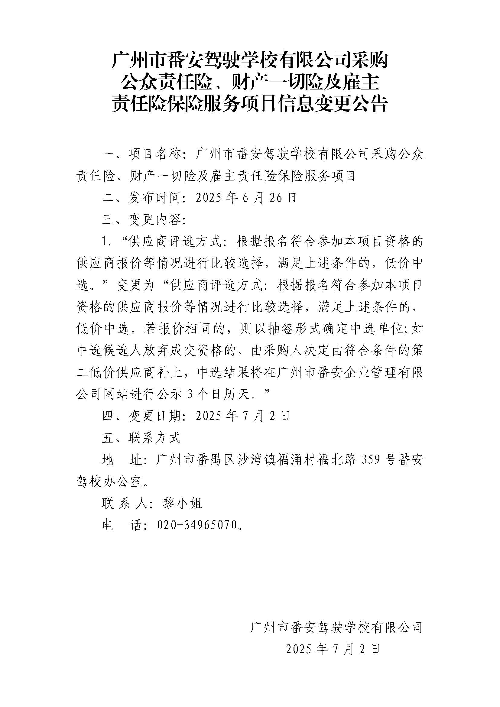 廣州市番安駕駛學(xué)校有限公司采購(gòu)公眾責(zé)任險(xiǎn)、財(cái)產(chǎn)一切險(xiǎn)及雇主責(zé)任險(xiǎn)保險(xiǎn)服務(wù)項(xiàng)目信息變更公告