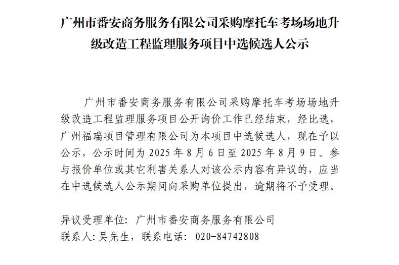 廣州市番安商務(wù)服務(wù)有限公司采購摩托車考場場地升級改造工程監(jiān)理服務(wù)項目中選候選人公示