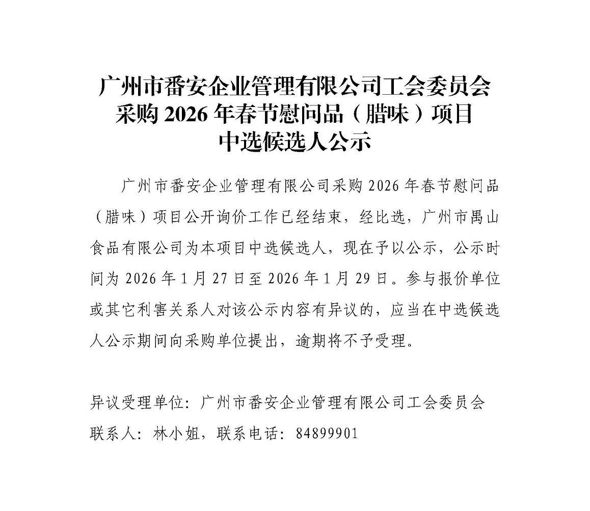 廣州市番安企業(yè)管理有限公司工會(huì)委員會(huì)采購(gòu)2026年春節(jié)慰問品(臘味)項(xiàng)目中選候選人公示